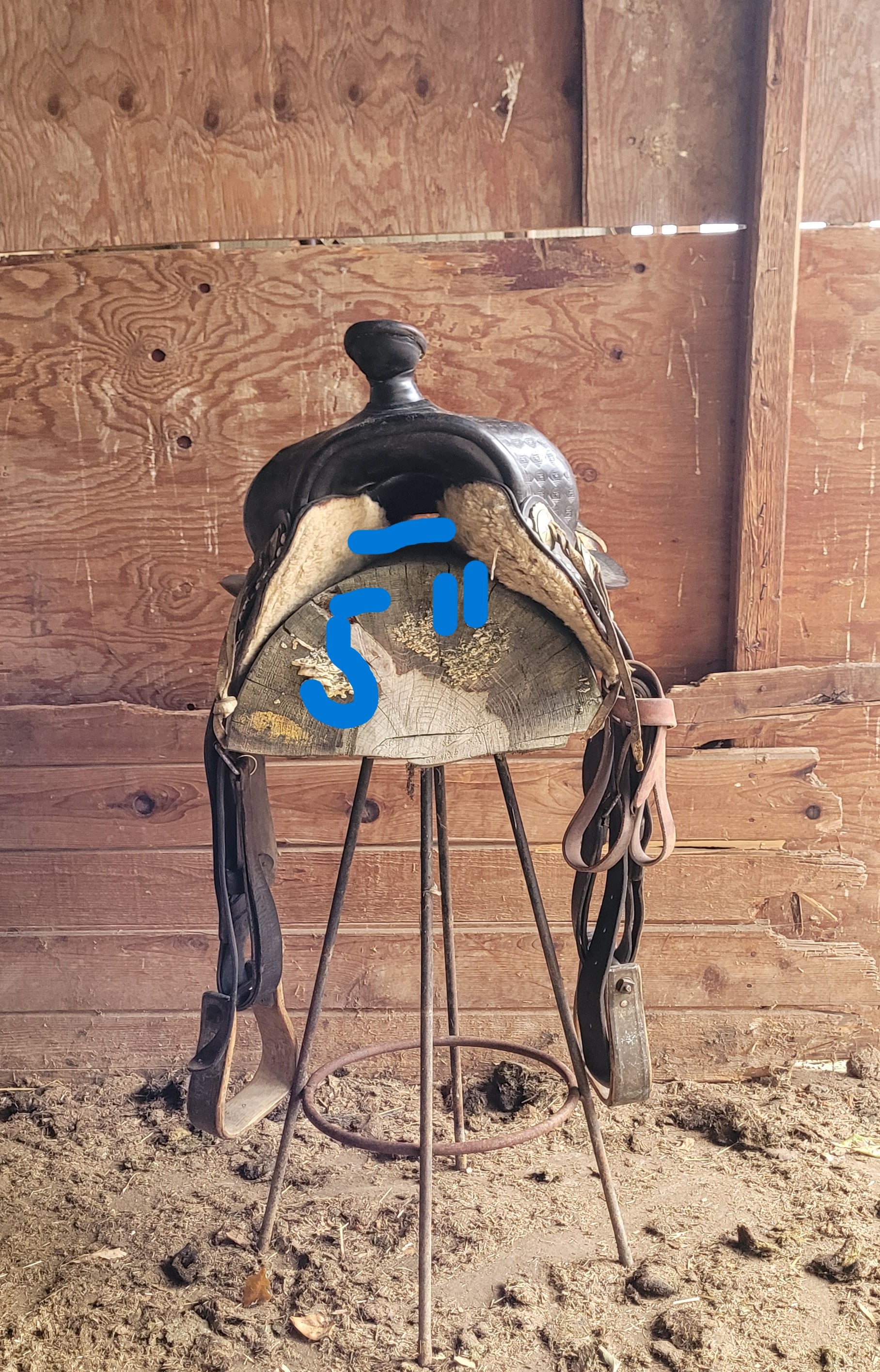 14 in western saddle. nice leatherwork. 9 kg. 1 latigo, no bilet. Brand: Simco.